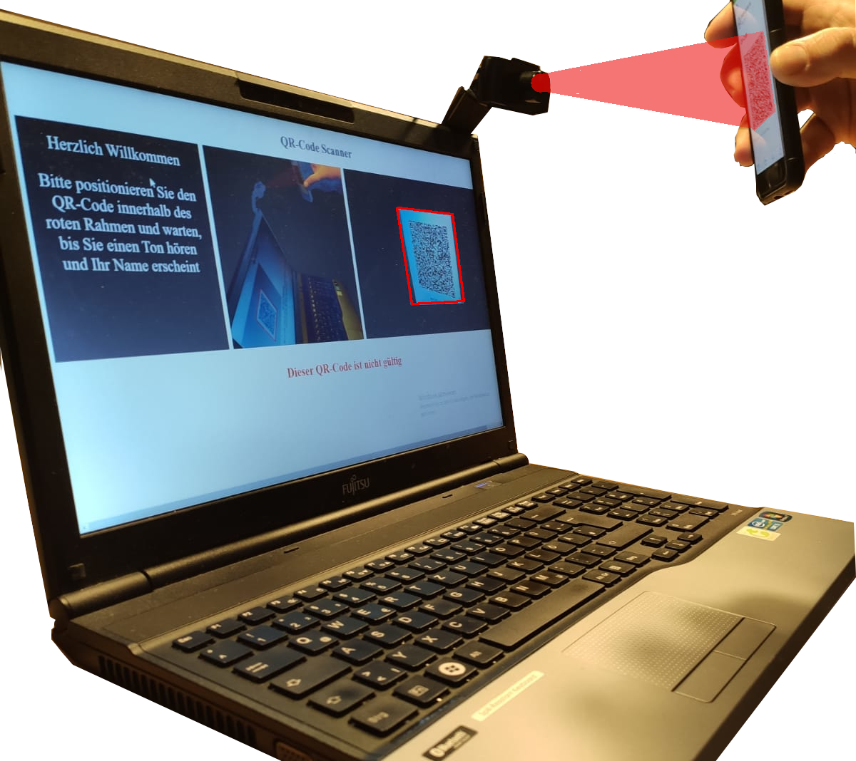 Bitte positionieren Sie den QR-Code innerhalb des roten Rahmen und warten, bis Sie einen Ton hören und Ihr Name erscheint